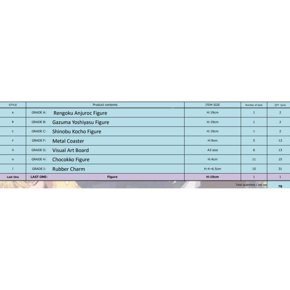 Japanese lottery with Kimetsu No Yaiba products. It contains 78 products and their corresponding 78 surprise tickets to exchange them for the prizes obtained.