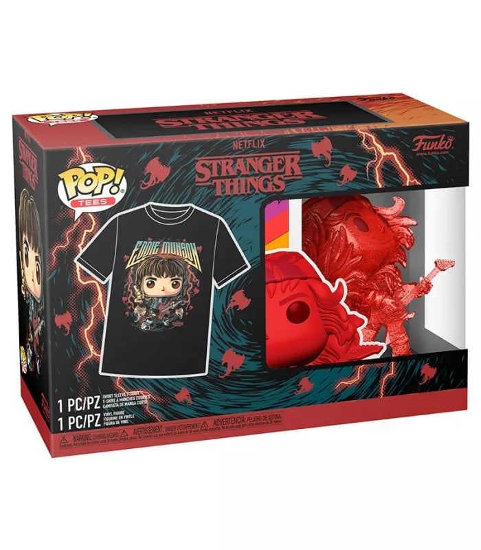 Relive the most epic moment from Stranger Things with this exclusive Funko Pop! Hunter Eddie with Guitar Vinyl Figure and T-shirt set! Eddie, rocking out in the Upside Down, comes to life in this collectible vinyl figure. The set also includes a T-shirt featuring Eddie in his ultimate rockstar moment, perfect for any fan of the series and metal music. This set is the ultimate gift to show your love for Eddie Munson and Stranger Things!