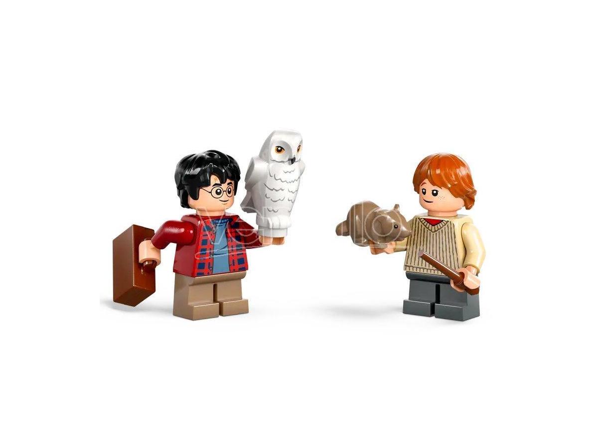 Adventure toy playset featuring 4 LEGO® Harry Potter™ characters – Harry Potter and Ron Weasley™ minifigures, Hedwig™ and Scabbers™ figures, plus a suitcase and 2 wand elements