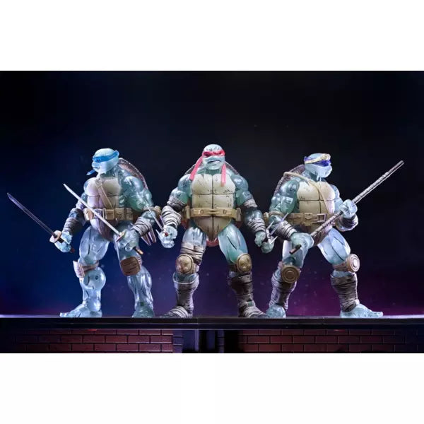 From the Teenage Mutant Ninja Turtles comic book series, The Last Ronin! Even though Michelangelo is the sole surviving Turtle in future NYC, Leonardo, Raphael, and Donatello live on in his memory. This Ghost Brothers action figure 3-pack from NECA features the characters commemorated in special spectral translucent plastic. The 7-inch scale figures include their signature weapons and extra hands and come in collector-friendly packaging with original artwork by The Last Ronin artist Ben Bishop.