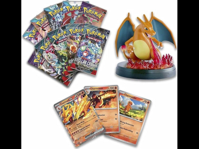 With flaming attacks and massive HP, Charizard ex flies over the battlefield. Bring that fiery tenacity to life on your desk, bookcase, or nightstand with a cool Charizard figurine with translucent fire effects to showcase a favorite card, such as Charmander, Charmeleon, or Charizard ex foil that you can also find in this collection! Even more fun awaits you in a stack of 10 booster packs from different Pokémon TCG expansions.